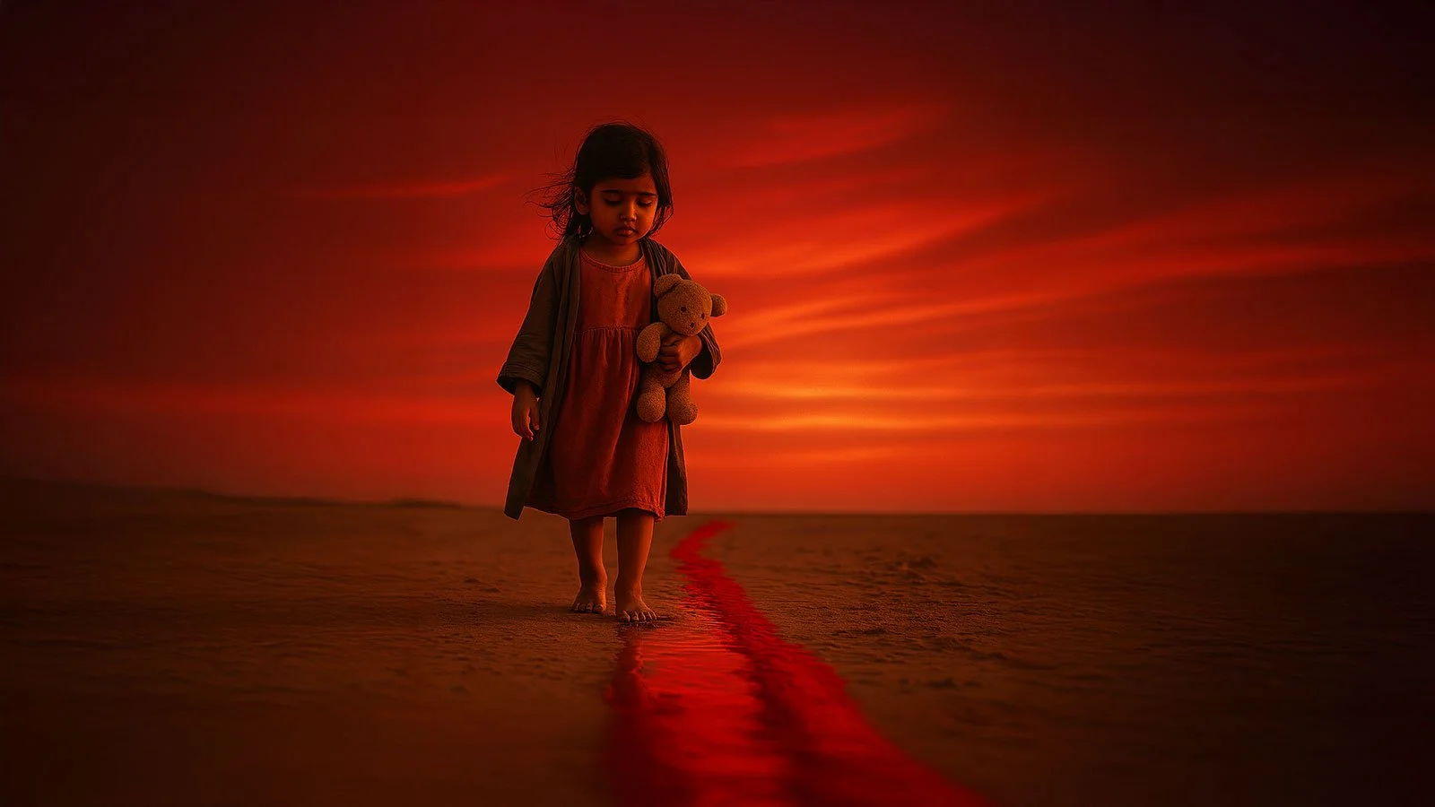 One of the strongest visual metaphors in the video is the red line of blood, drawn through the sand by children. It appears early and threads through the entire film. It represents war, loss, and the false borders that divide us—territories, ideologies, beliefs. Watch for it. It carries the weight of every scene.